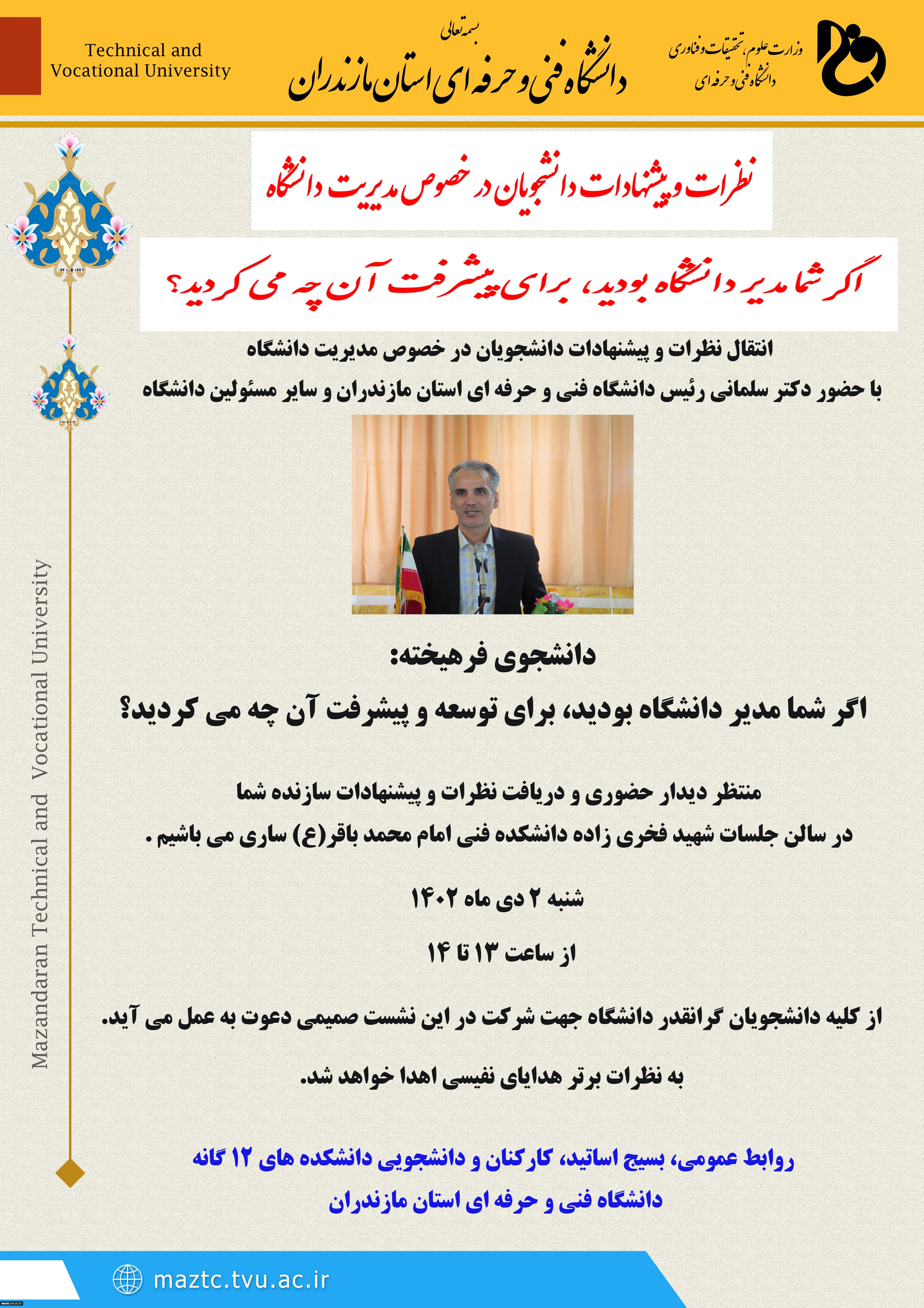 امتیاز دهید : انتقال نظرات و پیشنهادات دانشجویان در خصوص مدیریت دانشگاه با حضور دکتر سلمانی رئیس دانشگاه فنی و حرفه ای استان مازندران و سایر مسئولین دانشگاه 2 سهشنبه 28 آذر 1402 ساعت 13:58