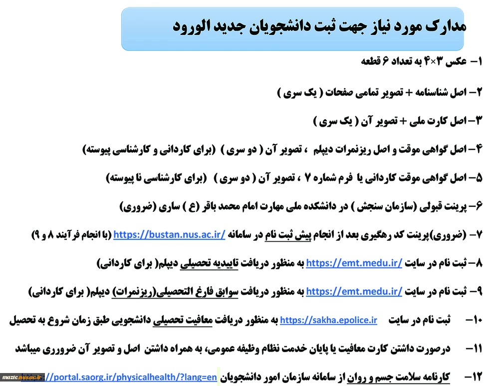 مدارک مورد نیاز جهت ثبت نام دانشجویان جدید الورود 2